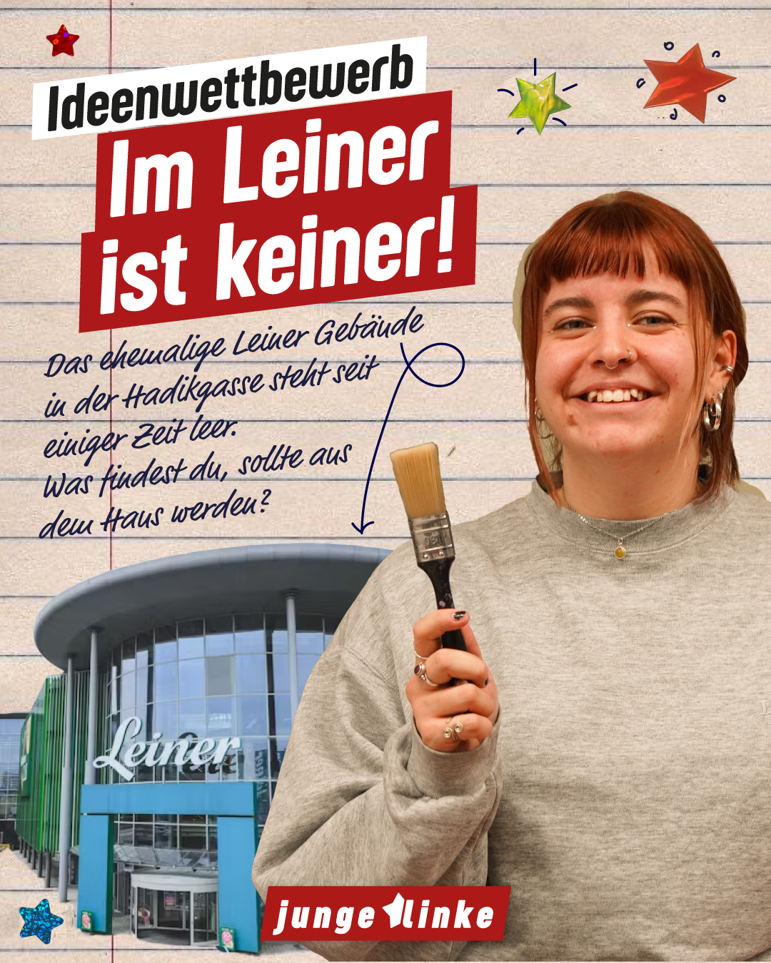 Preisverleihung IdeenwettbewerbEs wurde einige coole Ideen für das ehemalige Leiner Gebäude in der Hadikgasse eingesendet. Am 13.12 steht die Preisverleihung für die coolsten Ideen an! Los geht es um um 16.00 Uhr in der Drechslergasse 42.